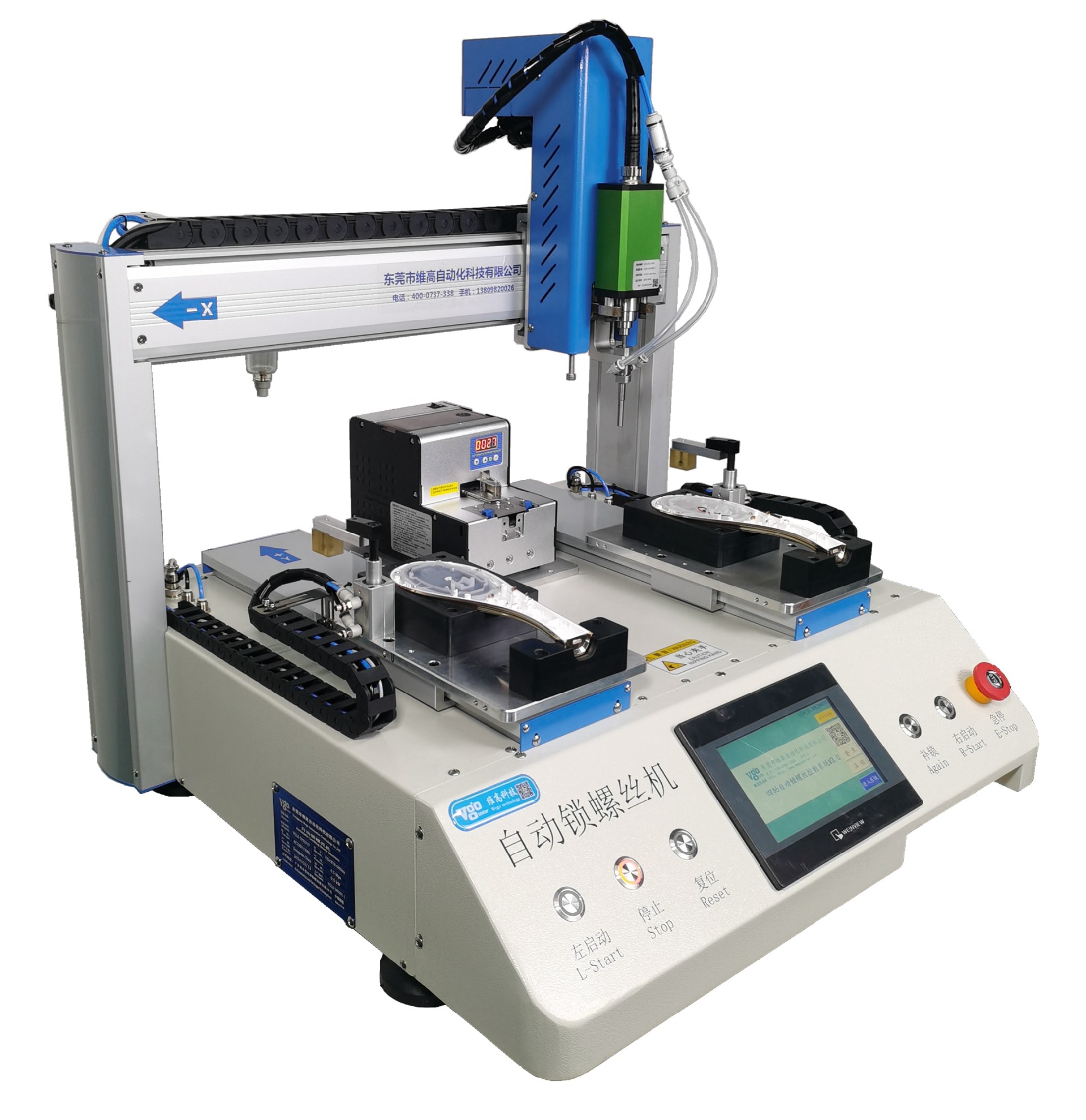 VGLS-TP5331V桌面式單頭雙工位自動鎖螺絲機一、用途適用于各類需要鎖附螺絲的產品。電子類產品如手機、計算器、導航儀、音響、筆記本電腦、鍵盤等;電器類產品如燈座、開關、風扇、電飯煲、冰箱等。二、主要功能整機功能由螺絲供料系統+精密定位系